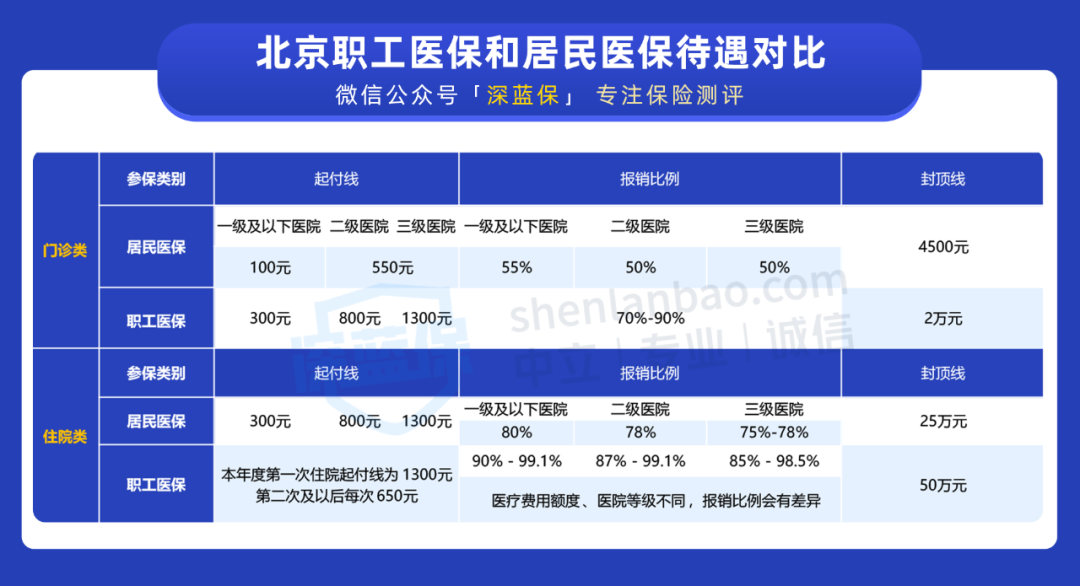 很显然,职工医保的报销比例、最高赔付额度都比居民医保高得多。
