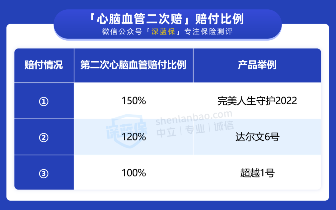 与恶性肿瘤二次赔付比例如出一辙,常规的赔付比例是 100%,高一点的能赔到 120%,最高的也有赔 150% 的。