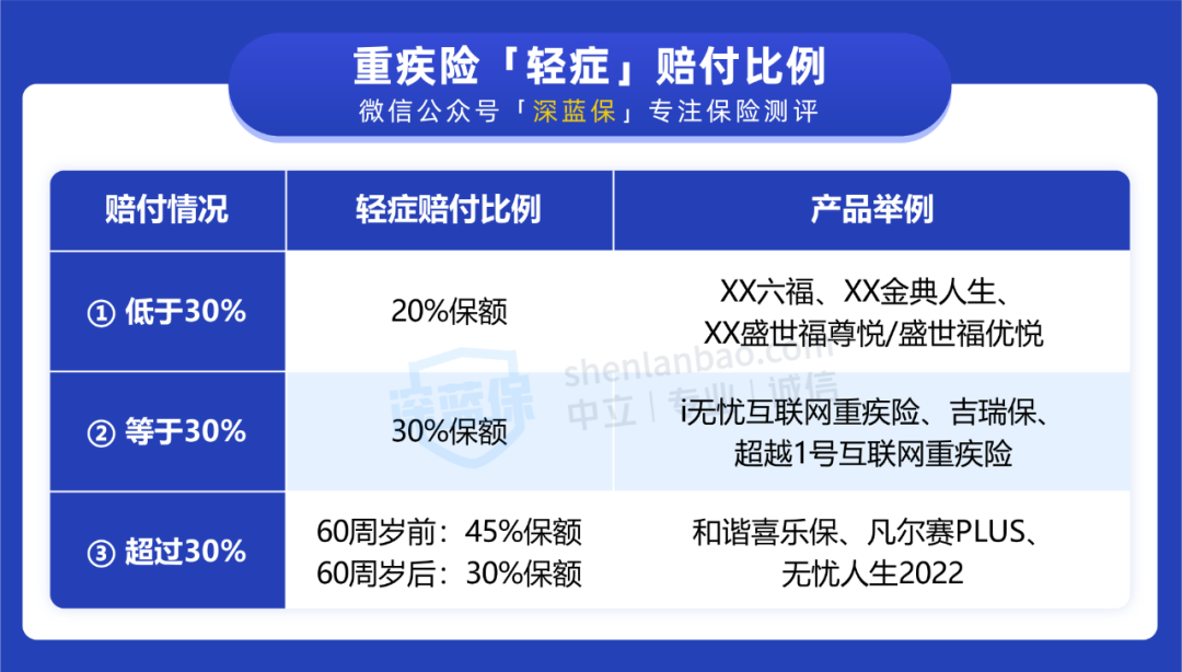 总之,轻症的赔付比例,等于 30% 已经是市场主流水平,高于 30% 则比较占优,低于 30% 的我们就要慎重考虑了。