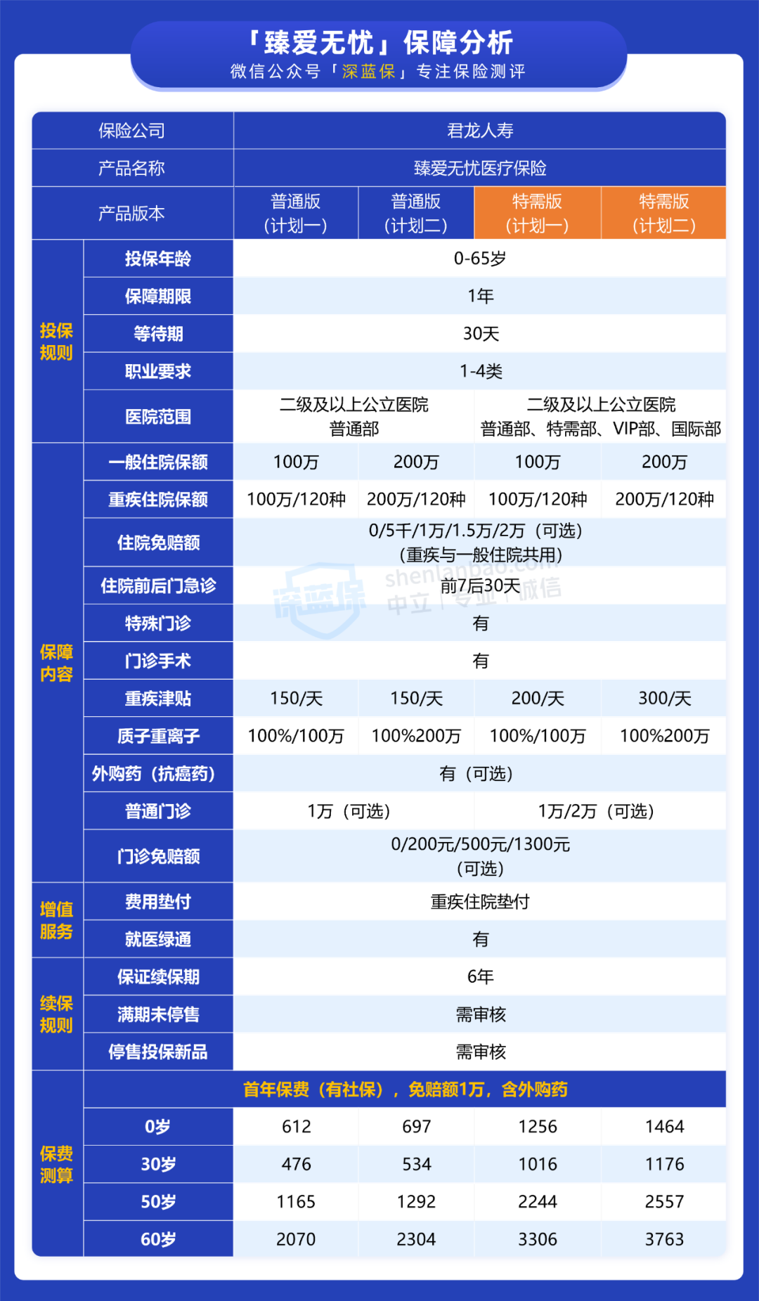 最近,君龙人寿就出了一款中端医疗险——臻爱无忧,它能 6 年保证续保,而且最低可选 0 免赔。