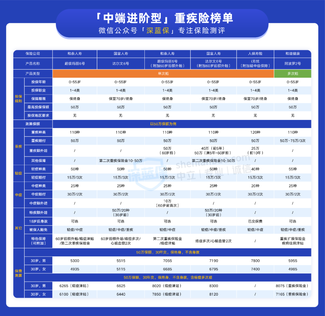 无忧人生 2022 最高能买 90 万保额,价格也便宜,如果想增加重疾保额,这款产品很合适。它可以附加轻中症保障,但要与 60 岁前额外赔保障一起附加,附加后,60 岁前重疾额外赔80%,轻中症也有额外赔。详细的测评,可以点击这里了解>>>不过附加后,相比其他产品,它的性价比并不高,如果有类似的保障需求,选择其他产品例如达尔文 6 号会更好。“达尔文”系列的产品一直都是热门之选,达尔文 6 号 也是不负众望,保障同样不错:达尔文 6 号 的基础保障比较全面,自带第二次重疾保险金,如果 60 岁前不幸患重疾,赔付后,间隔满 1 年再患其他不同种重疾,也还能再赔一次,最高 100% 保额。另外,附加重疾额外赔后,60 岁前它最高能额外赔 100% ,保额充足,具体产品测评可以点击这里了解>>>神盾七号 是最近上线的一匹“黑马”,一起来看看它的优势与特点:神盾七号 的保障很全面,还自带第二次重疾保险金,若 60 岁前首次确诊重疾、且 3 年后再次确诊其他不同重疾,能再获赔 100% 保额。另外,附加 60 岁前额外赔后,它的轻、中、重疾也都有额外赔,保障还不错。以上几款重疾险,点击这里 进入深蓝保小程序就能找到,里面也能测算保费。如果还是不清楚自己适合哪款,也可以点击下面图片,咨询专业的规划师。一些预算较为充足的朋友,想要终身都有保障,这样晚年重病也能有所应对,不会给家人造成太大的经济负担。我们也为这些朋友挑选了中端进阶型产品,它的选取标准是:重疾保终身,保障更全面,预算在 5000~8000 左右。“超级玛丽”系列的产品,在重疾市场上的热度不输“达尔文”,超级玛丽 6 号 的保障也非常亮眼:超级玛丽 6 号 无论是基础版还是附加 60 岁前额外赔,保终身的价格都比其他产品便宜一些,保障也很全面。附加 60 岁前额外赔后,它的重疾能额外赔 100%,中症也能额外赔 20%,非常不错。它还可选第二次重疾保险金保障,对第二次重疾没有年龄限制,且相同疾病也能赔,但要注意需间隔 3 年。我们做了详细测评,可以点击这里了解>>>而 达尔文 6 号 自带第二次重疾保险金,附加 60 岁前额外赔后,保单满 5 年重疾也能额外赔 100% ,保终身性价比同样不错,可以考虑。i 无忧 是人保寿险的重疾产品,公司知名度较高,一起来看看它的优势与特点:i 无忧 本身只有重疾保障,轻/中症保障需要自己附加,我们建议大家附加上,这样保障会全面一些。具体的产品测评,可以点击这里了解>>>这款产品的健康告知,对乳腺结节、甲状腺结节的要求比较宽松,有此类问题的朋友可以优先考虑。(点击了解)阿波罗 2 号 由和谐健康承保,是一款多次赔产品,一起来看看它的优势与特点:阿波罗 2 号 是一款多次赔重疾险,价格很便宜,30 岁女性购买只比 超级玛丽 6 号 贵 50 元,重疾赔完还能有保障,再次患其他重疾能赔 150% 保额。另外,它还能附加 60 岁前额外赔,附加后轻中重疾有 10%~60% 的额外赔,保障也很不错。以上几款产品,点击这里 进入深蓝保小程序就能找到,里面也能测算保费。如果不清楚自己身体情况,是否符合产品健康告知的要求,也可以点击下面图片咨询专业的规划师。一些收入较高的朋友,在保额充足的基础上,还希望有更全面的保障,如能附加身故保障、癌症二次赔或重疾能赔多次等。因此,我们评选出高端顶配型榜单,标准为:保终身、含身故,重疾多次赔,还有癌症 2 次赔等,价格在 8000 元以上。如果要附加癌症保障,超级玛丽 6 号的癌症津贴会更优秀一些,患癌 1 年后,假如仍处于癌症状态,可额外赔付 40% 保额,最多能赔 3 次,有需要的朋友可以优先考虑。另外,阿波罗 2 号 附加“ 60 岁前额外赔”后,性价比也很高。如果预算充足,想要带身故、重疾多次赔的朋友,这款产品也值得考虑。满天星 由富德生命承保,也是一款多次赔产品,一起来看看:满天星 自带重疾重疾额外赔,前 15 年确诊重疾,能赔双倍保额,最多赔 3 次。不过它对部分年龄段的保额有限制,投保时要注意。表中还有另外一款多次赔产品 康瑞人生,相比其它保终身含身故的产品,它的价格很便宜。要是想要多次赔保障,预算又没那么多,可以考虑它。这里提醒大家:超越 1 号的癌症 2 次赔和心脑血管 2 次赔,这两项是捆绑在一起的,且附加后,癌症和心脑血管只能赔其中一项。不同年龄,重疾险的价格也不同,点击这里 进入深蓝保小程序就能找到产品,里面可以测算保费。市场上的重疾险非常多,每个产品的特点也都不一样。在挑选前,要明确自己的需求,结合需求筛选产品,才能更容易找到适合自己的。同时也要提醒大家,保险的本质是抵御经济风险,在配置保险时,要量力而行,不要给自己造成经济压力。有其他的疑问,也可以在文末扫码,预约专属规划服务。如果今天的分享对你有用,就在文章底部点个“在看”吧,也欢迎转发给有需要的亲朋好友。 :)