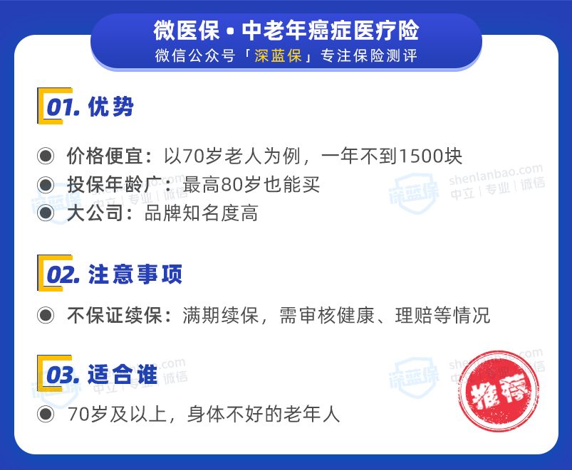 微医保 · 中老年癌症医疗险 同样由平安健康承保,适合高龄老人选择,它的优势与注意事项如下: