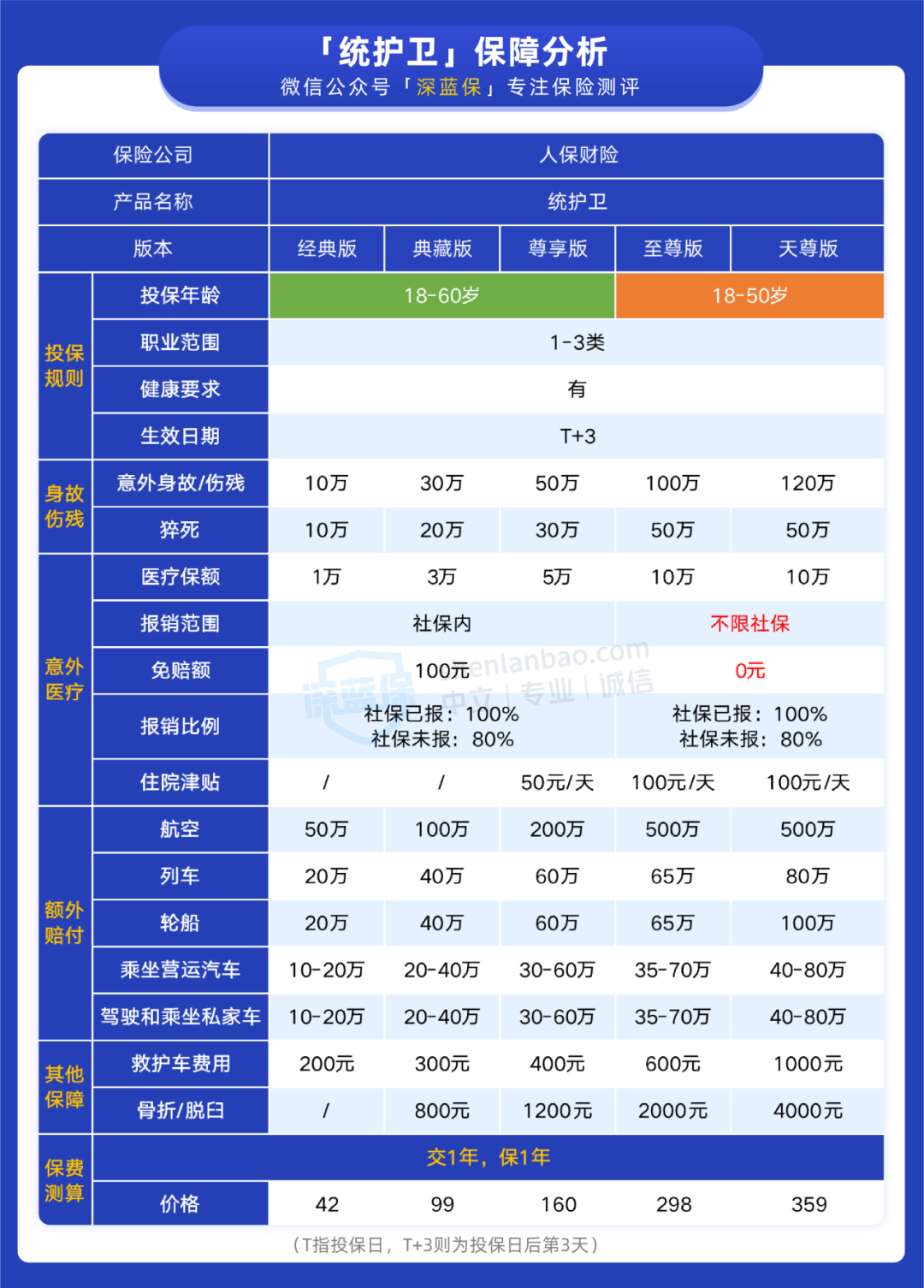 统护卫(点击了解)一共有 5 个版本,保额最高可选 120 万。我们把它的保障进行了整理,具体如下: