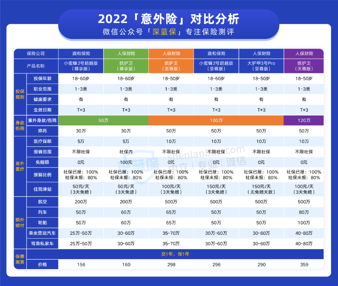 因此,我们选 2 款热销的意外险,分别与统护卫的 50 万和 100 万版本作对比,具体如下: