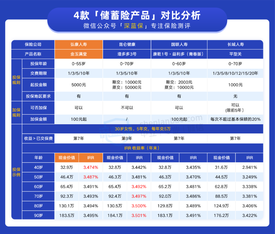 如果实在不知道怎么看,我们也搜集了目前市面上在售十几款热门增额寿,全都测评对比了一遍,最后挑选了三款关注度较高的产品,和马上就要下架的金玉满堂做对比,具体如下: