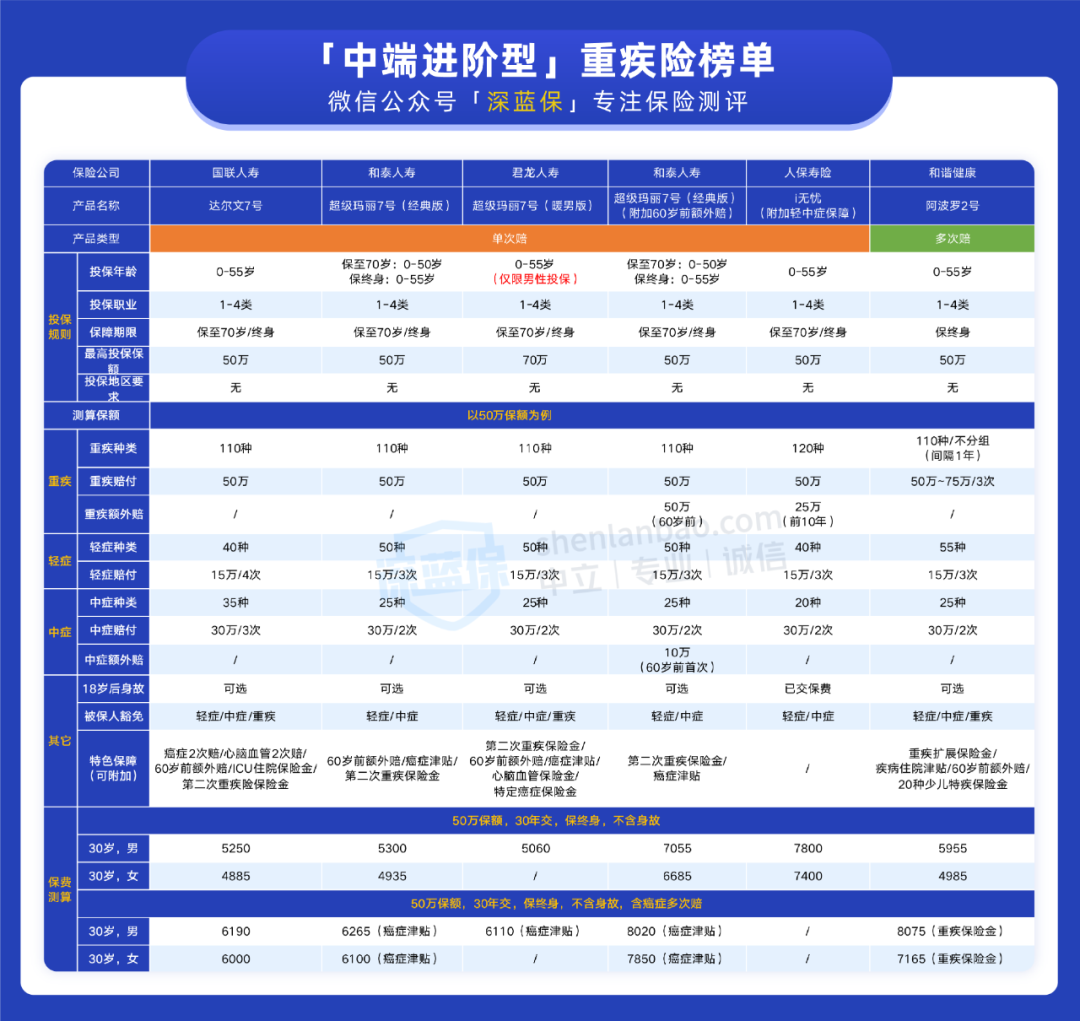 这里我们给大家准备了经济实用型榜单,适合预算有限的朋友。它的标准是:保到 70 岁的 消费型重疾,适合预算在 3000~5000 左右的朋友。