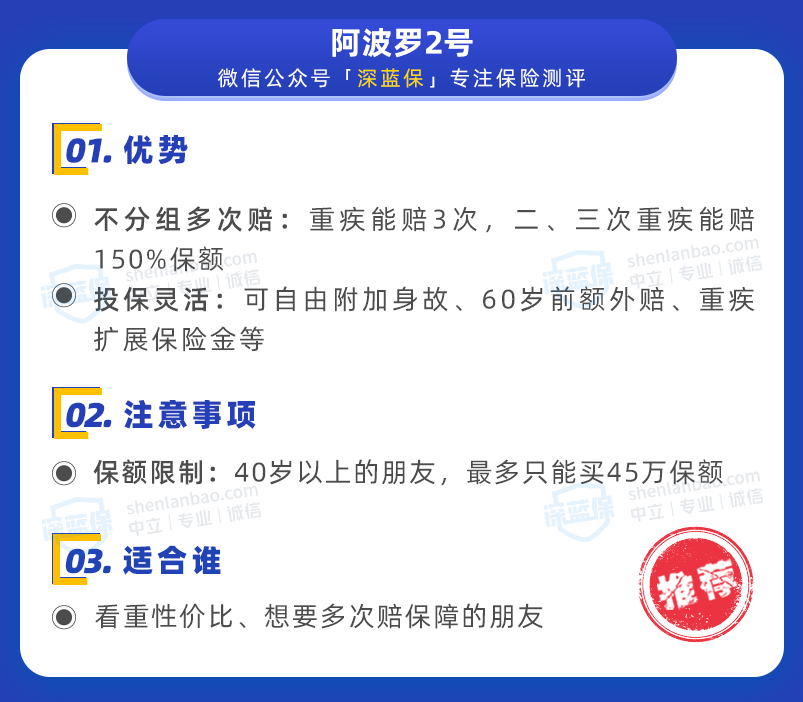 另外,阿波罗 2 号 附加“60 岁前额外赔”后,性价比也很高。如果预算充足,想要带身故、重疾多次赔的朋友,这款产品也值得考虑。