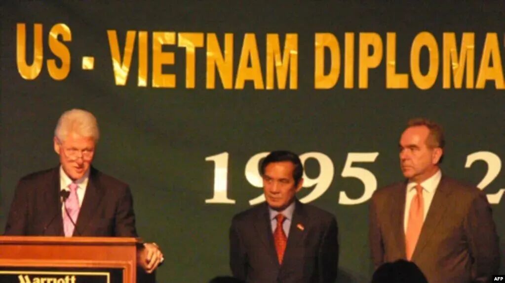 图为2010年美越建交15周年纪念活动,美国前总统克林顿(左一)与坎贝尔(左三)