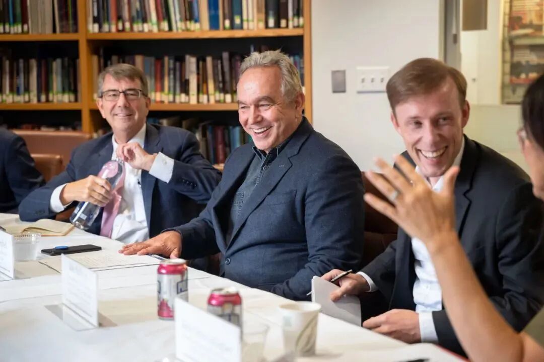 图为2019年一次研讨会上,坎贝尔与美国国家安全顾问沙利文(右一)相谈甚欢
