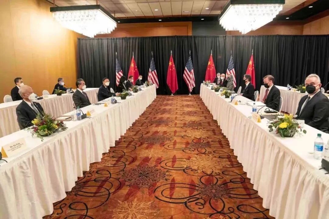 图为2021年3月中美安克雷奇高层战略对话现场,右一为坎贝尔
