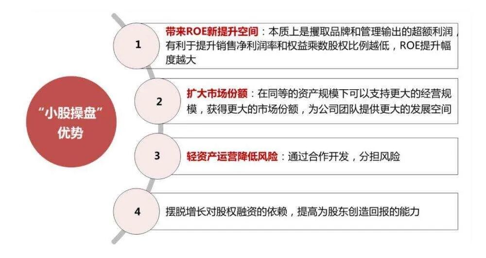 小股操盘又称为「股权式代建」,是指房地产企业在合作项目中只占有较小比例的股份,虽然按照房地产开发的相关规则,小股介入不能直接获得项目实际操盘的权利,但根据委托方和代建方的相关委托协议,项目仍然由持小股的团队操盘,使用公司品牌、产品体系和管理,共享企业的信用资源和采购资源,提升项目回报。「小股操盘」是国际上房地产开发的主流模式之一,即品牌公司在合作项目中不控股,但项目仍由品牌团队操盘。从实际情况来看,目前小股操盘的持股比例 30% 以下,同时持股比例受双方品牌实力、风险评估、服务模式等方面影响,并没有固定的比例。对代建企业而言,股权式代建不仅收取代建服务费,还享受股权收益以及溢价分成。万科等企业就在近几年选择小股操盘以及内部跟投作为新的房地产开发模式。在收益分配上,万科通常会与项目方约定项目的预期收益标准,并设立浮动的奖励分配方案,而非简单按照股权比例进行分配。通常而言,万科将赚取股权收益、项目管理费和项目超额利润分配。金融资本作拥有开发项目 100% 的股权或者部分股权,以代建委托主体的身份,寻找与待开发项目品牌理念、产品匹配度、客户匹配度等相契合的代建开发商,签订委托代建合作协议,明确相关各方职责和权利,由代建方负责开发全流程的管控。这种模式多见于项目委托方拿地之后面临一定的开发资金短缺,代建方在看好项目发展前景的基础上,引荐金融资本加入项目股权、夹层或者债权。从母公司花样年分拆上市的彩生活,是时下房企轻资产运作的一个成功范本。2014 年 7 月初,虽然当时彩生活的利润仅仅是母公司花样年的十分之一左右,但上市仅 3 天的彩生活市值达 55 亿,轻松反超花样年 52 亿元总市值,引起了极大的关注。这几年,物业公司在香港出现了上市潮并不为过,截至 2019 年 3 月,已经登陆港股市场的内地物业管理公司有 8 家,包括碧桂园服务、中海物业、绿城物业和雅生活等。![]()