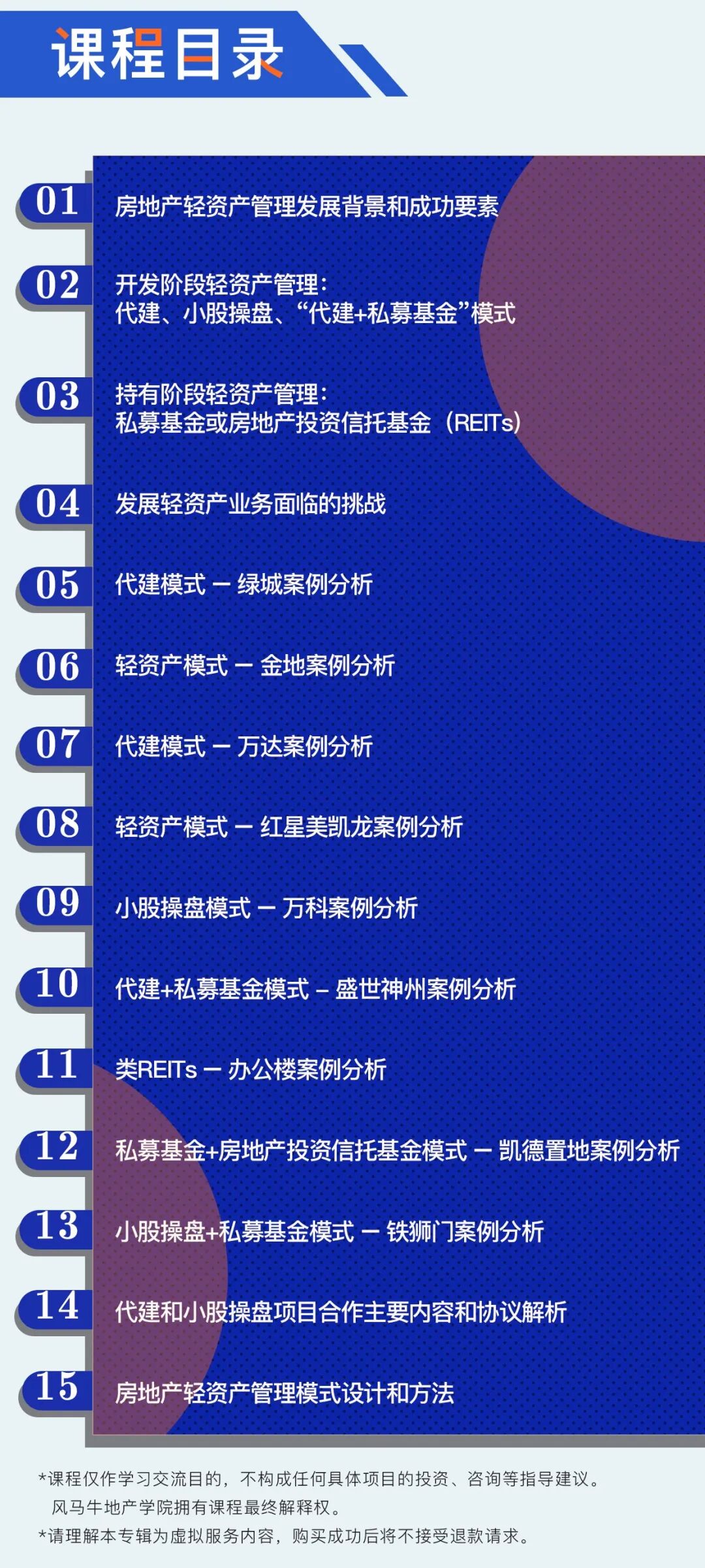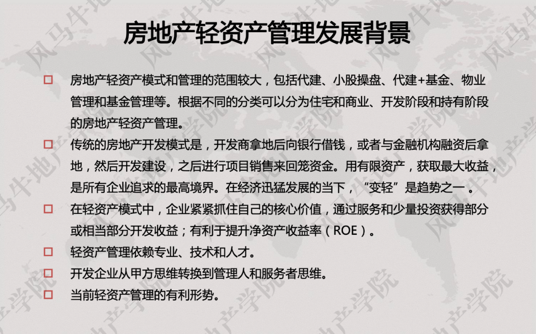 房地产企业要做轻资产管理,首先要发现和挖掘优势,也就是要发挥品牌优势和运作能力的优势。万科模式、保利模式、万达模式等都可以成为国内许多企业的标杆,但每家企业需要结合自己的优势、特点和战略等。虽然凯德置地在房地产轻资产管理方面非常领先,但其所处的国际资本环境不同,国内开发商可以学习其理念和很多方式,但也不能去全盘模仿凯德。针对国内房企在轻资产模式当中的痛点,我们推出了《透析房企轻资产模式的 15 堂课》,详细解读房地产企业目前运作的轻资产模式、难点、关注重点及相关案例分析。如果你在各类房地产开发、投资、基金、资产和物业管理公司从事管理、战略、投资、研究、融资、财务等行业,或从事证券、公募基金及其子公司、信托公司、保险公司、投资者、律师、审计师、估价师等职业,那么一定不要错过这 15 节轻资产运营课程。![]()