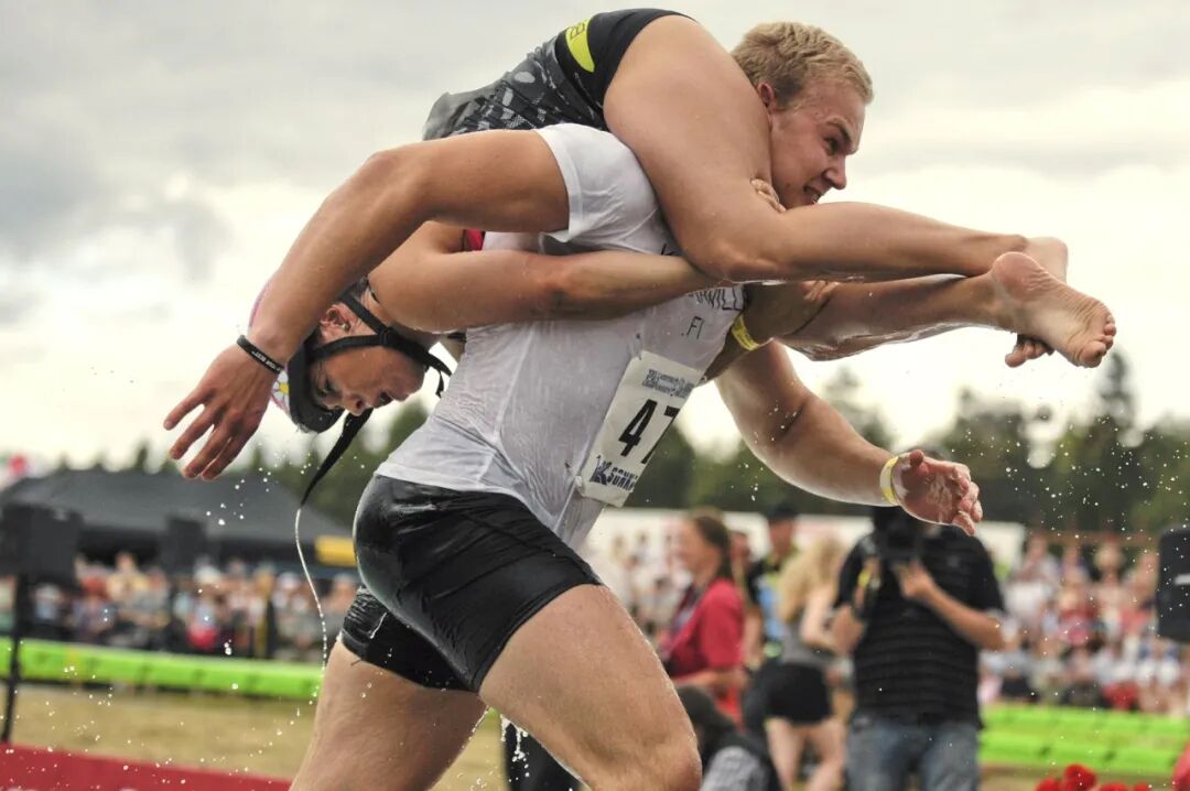 背老婆大赛(Wife Carrying World Championship)则是另一久负盛名的怪异比赛。关于这项比赛的起源,如今尚有多种说法,但都与芬兰有关:一说有群强盗常常劫掠周围村庄的资源和妇女,会把妇女背在背上带回去;一说强盗头目会叫手下背重物跑步以训练抢夺能力;还有一说是芬兰曾有年轻男子到附近村落抢来已婚妇女与其结婚的风气。1994年,第一届背老婆大赛在中部小镇桑克加维成功举办。2014年亚军Rich Smith和Anna Marguerite Smith©️NBC