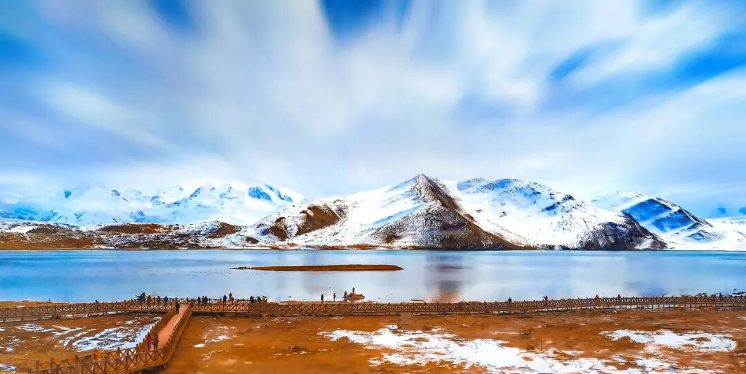 在柯尔克孜语中,喀拉库勒湖意为“黑湖”,可能是因为在看过冰川的强烈反光后,视觉上觉得湖水变成了黑色。但如果你在湖边待得足够久,便会发现在不同的光照耀下,这其实是个变色湖。这里夏季湖边开满野花,冬季则一片冰封,最经典的画面则是将身后“昆仑三雄”的伟岸身影映在明晃晃的湖面上。💰 43元