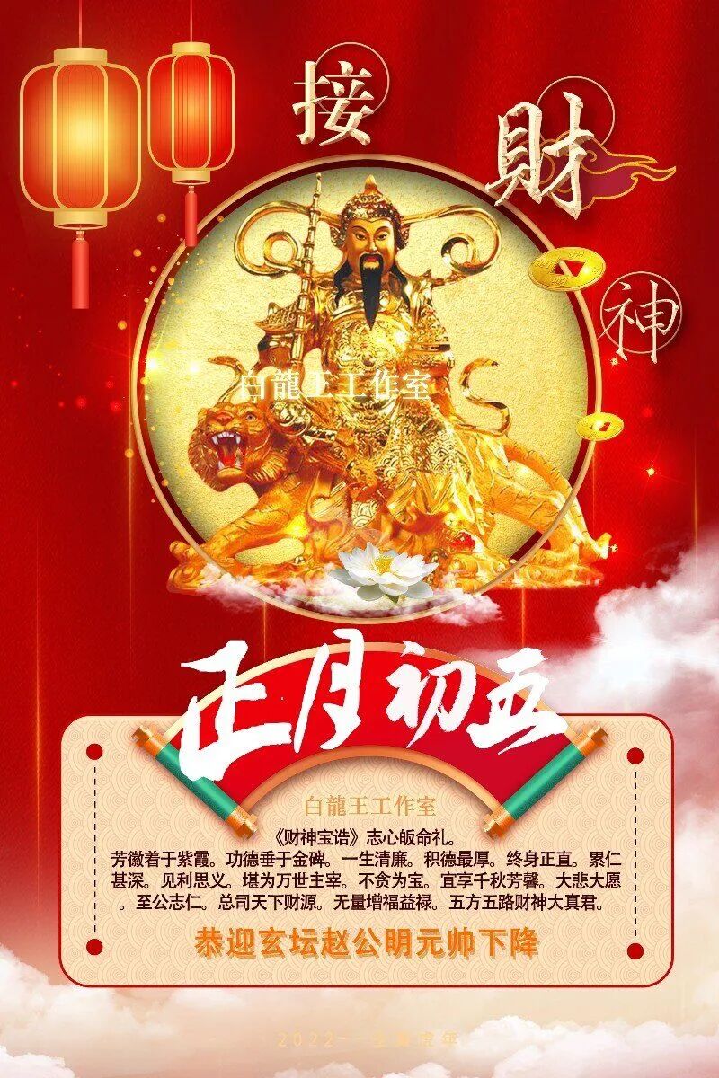 正月初五是五路财神按方位查察,记录善恶以凭赏罚。而赵元帅的诞辰在农历三月十五日、九月十五。所以,正月初五接财神,我们接的财神是玄坛赵公明和其部下五路财神。这点一定要明白,否则接错主神,道法不灵,反受其咎。