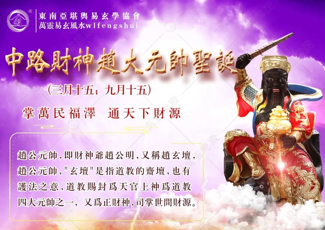 位列玄坛。金轮如意。黑虎吼时。天下妖魔皆丧胆。金鞭起处。世间邪魅悉潜形。受命玉帝。管理财源。统帅雷霆。号令火。赏善罚恶。至公至正。大悲大愿。巡查坛院。玄坛赵天君。掌理天下财源。督财府中大元帅。