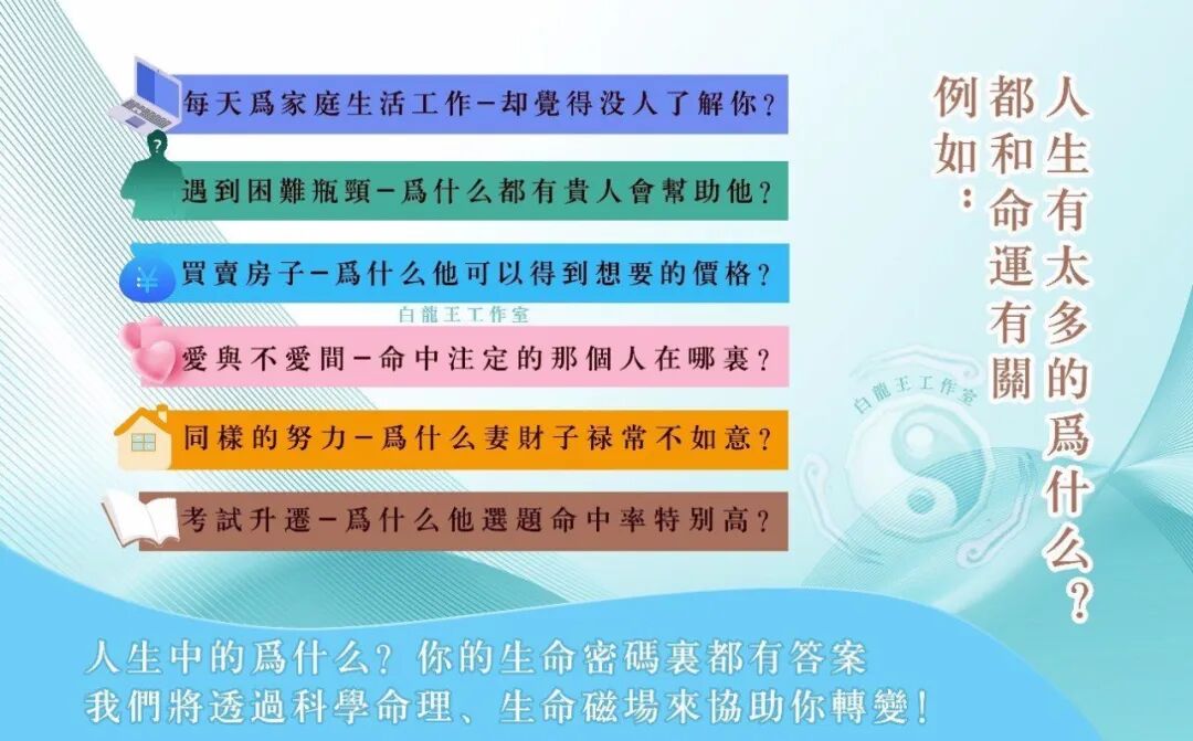 反过来,有些当下走的顺风顺水的朋友,白龙王许老师告诉他,你不要投资、你不要做那件事、你不要离婚你不要……这些就会有人听不进去了,原因也很简单,过于相信自己,忽略了命运的力量。那么命运的力量从哪里来呢?