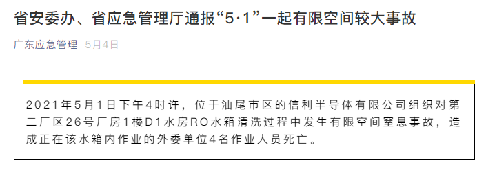 5月1日下午4时许,位于汕尾市区的信利半导体有限公司组织对第二厂区26号厂房1楼D1水房RO水箱清洗过程中发生有限空间窒息事故,造成正在该水箱内作业的4名作业人员死亡。