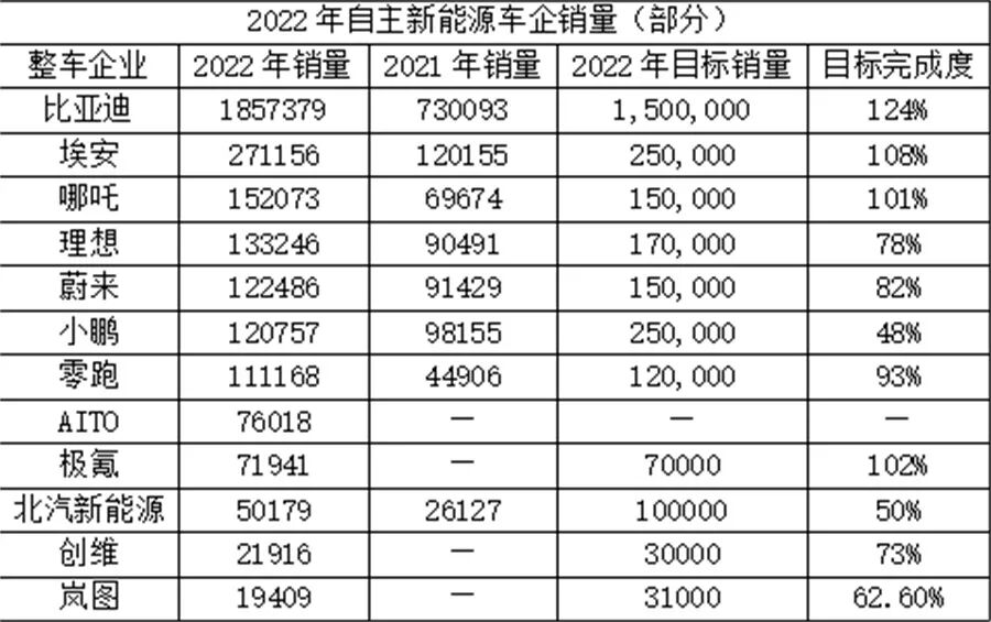 某种意义上来说,新能源汽车是2022年的主角之一。不过,遗憾的是,自主新能源车企的KPI完成率并不算太高。《道哥说车》编辑经统计目前已经公布全年销量的新能源车企销量数据以及年初定下的目标发现,2022年完成销量目标的新能源车企只有比亚迪、哪吒、埃安、极氪三家,而其余车企均未完成。
