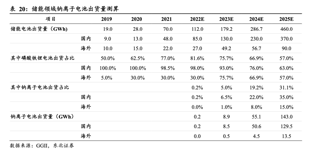储能经济性诉求推动钠电发展,钠电产业链日益完善支撑渗透率加速提升。随着钠离子电池产业化逐渐成熟,钠离子电池凭借成本优势、能量转换效率高、循环寿命长、维护费用低等优势,在储能领域中加速渗透。我们假设:基于全球能源转型进程,风电、光伏等新能源装机量及储能配套比例,独立储能需求量对储能电池出货量进行假设;钠离子电池凭借度电成本优势在储能领域逐渐渗透,基于 2022 年钠离子电池行业中游原材料产能规划情况对 2022-2023 年储能装机量进行估算,2024-2025 年随着产业成熟有望加速渗透,预计 2022-2025 年储能领域渗透率分别为 0.2%/5%/19.2%/31.1%;国内钠电产业链成熟度领先,国内钠电储能电池出货渗透率高于海外。基于以上假设,预计 2023-2025 年储能领域钠离子电池出货量分别为 8.9/55.1/143.0 GWh,三年复合增长率 300%。