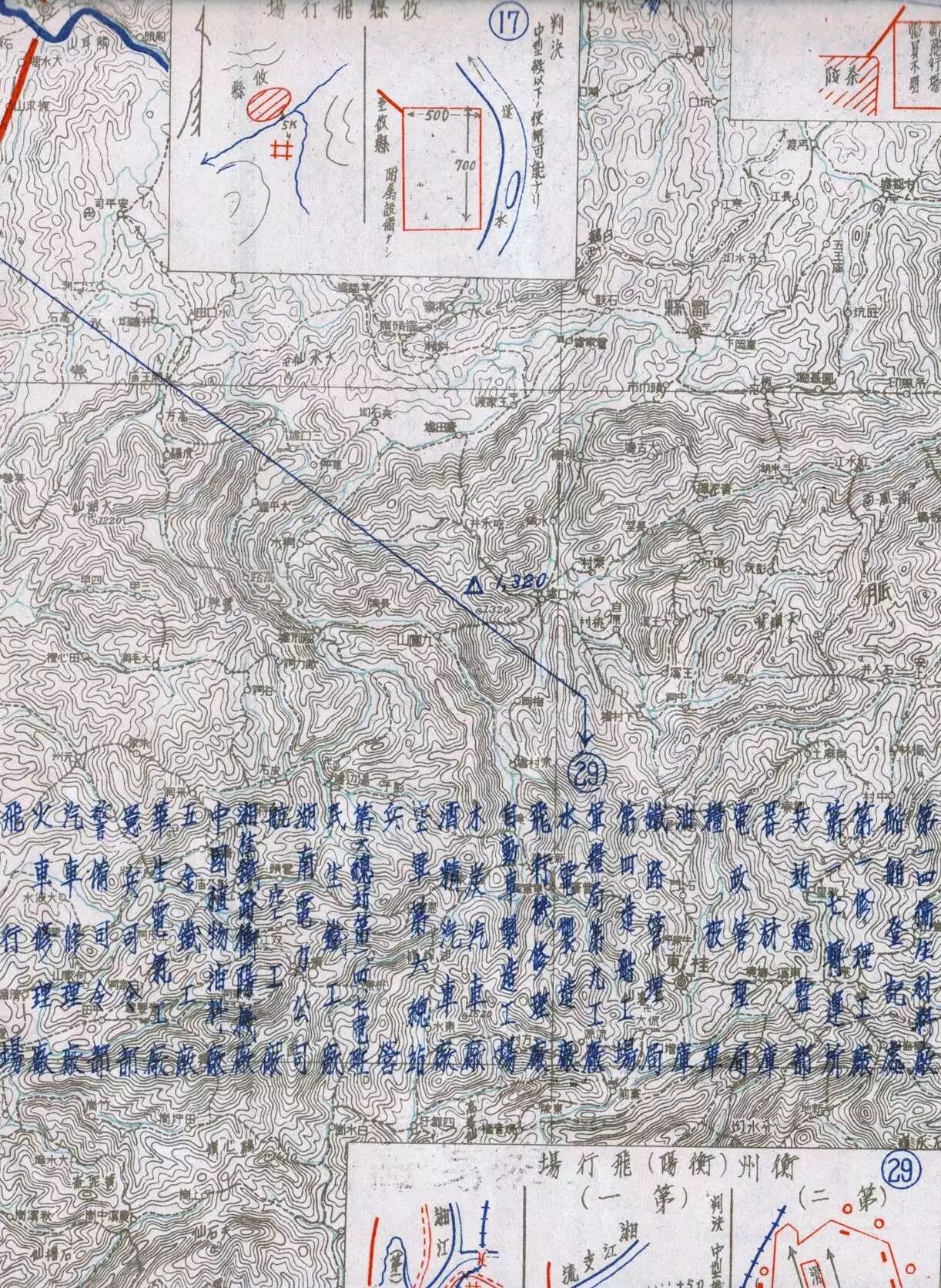 但我很快就注意到另外一个问题。在这些气压等压线图的背面,还有一种真正的军事地图。大部分都用了红蓝黑三种颜色,再看图例和说明,有如“南支那五万分之一 芜湖十七号 繁昌 兵要地志图”类似字样,很显然,这是日军侵华时期的军用图。和正面的图不一样地是,日军的这些图绘制的极为详尽。小到一座桥能承重多少,能通过什么样的运载工具,大到一条河的水位、汛期、铁路沿线的村庄城镇等,都一一标注清楚。最详尽的一张是江西全境重要军事设施图,从赣南到长江沿线,机场、粮库、军需站、兵站等,全部做了标注,十分清晰。试想一下,如果抗战时期,中国的情报人员能得到这些东西,对于军事部署,该能起到不可估量的帮助。