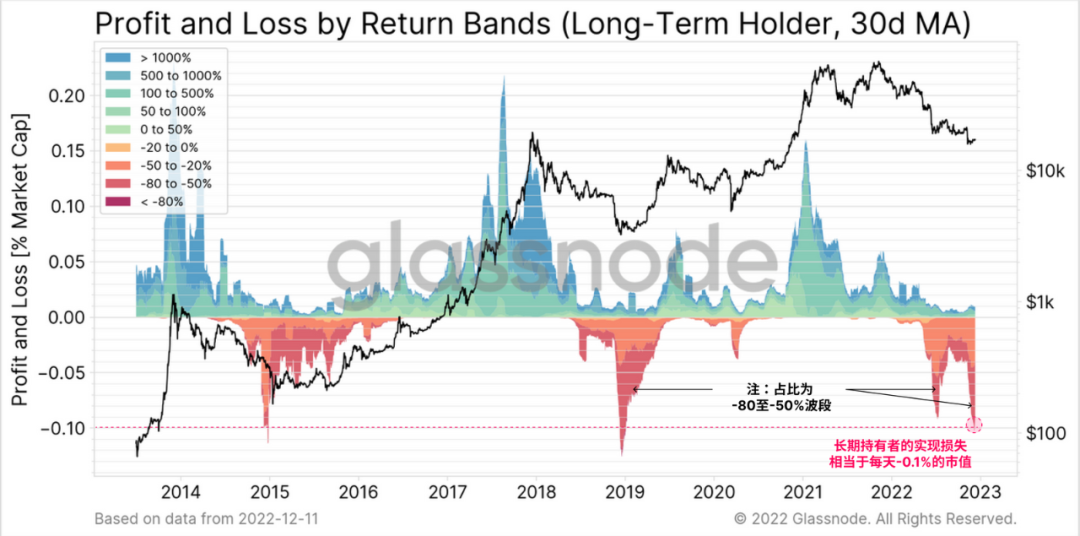 值得注意的是长期持有者的贡献,他们在这个周期实现了历史上两个最大的相对损失高峰。截至11月,长期持有者的损失达到了每天占市值的-0.10%的峰值,其规模仅与2015年和2018年的周期低点相当。6月份的抛售也同样令人印象深刻,每天损失市值的-0.09%,长期持有者的严重主导地位锁定了-50%至-80%的损失。