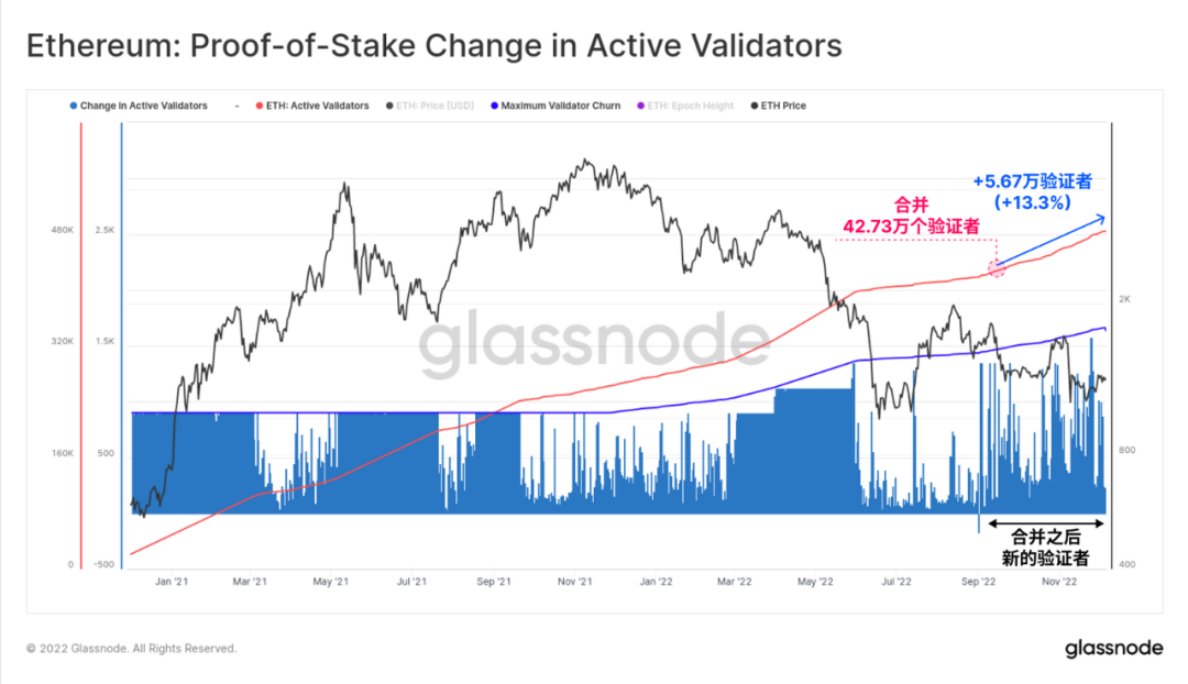 自合并以来,活跃的验证人的数量增加了13.3%,现在有超过48.4万个验证人在运行。这造成质押的以太坊总量达到1561.8万枚,相当于流通量的12.89%。