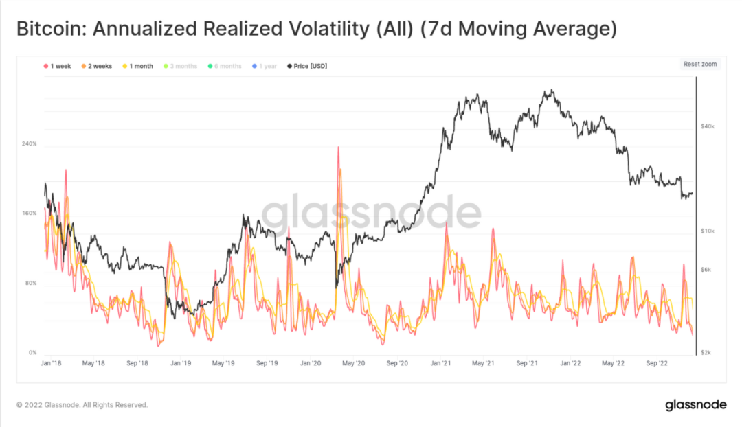 在经历了真正混乱的一年后,比特币市场在进入12月后变得非常平静。比特币的短期实现波动率目前处于多年来的低点,为(1周)22%和(2周)28%,是2020年10月以来的最低波动率。