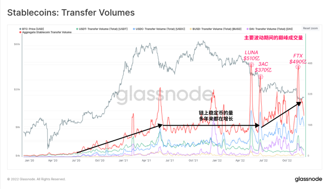 在5月、6月和11月的高波动性抛售事件中,稳定币的总转账量达到了370亿至510亿美元之间的峰值,这表明在去杠杆化事件中,投资者对美元流动性的极端需求。