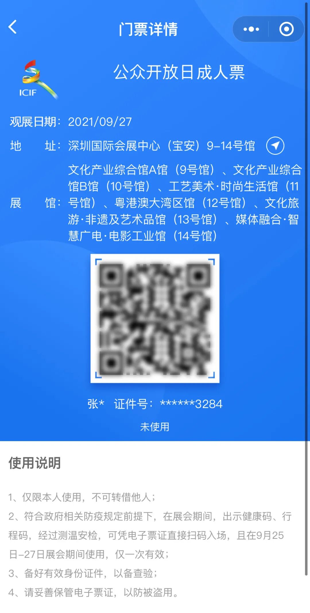 3.符合政府相关防疫规定前提下,在展会期间,出示健康码、行程码、持48小时内新冠病毒核酸阴性证明,经过测温安检,可凭电子票证直接扫码入场,且在9月25日-27日展会期间使用,仅一次有效;