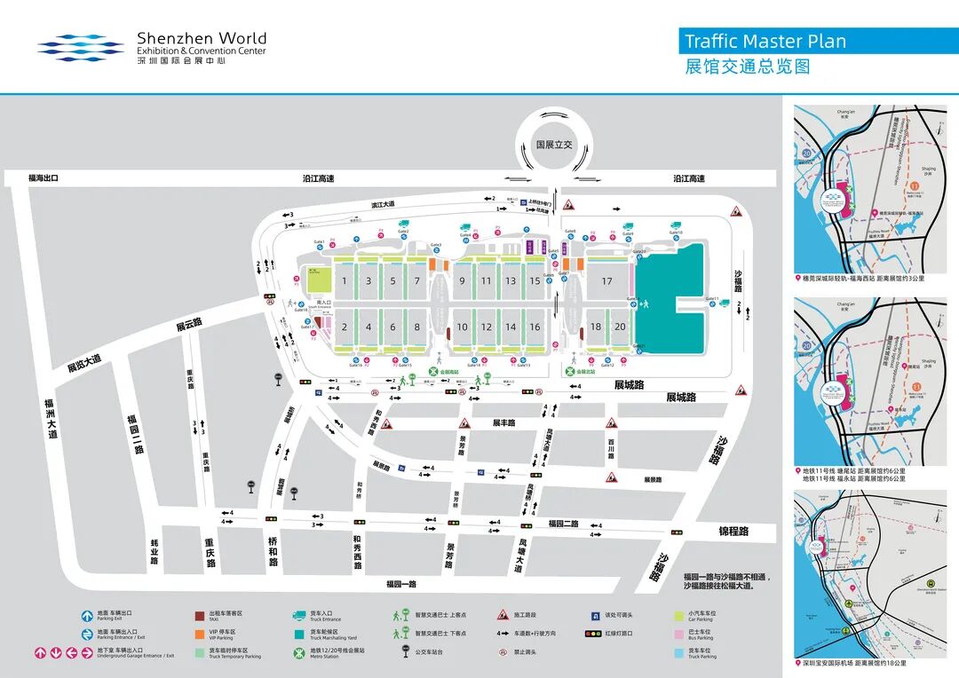 配备智慧公交,接驳地铁11号线塘尾站和机场,在展馆和周边的地铁站、巴士场站、商业中心区、酒店等地往返。