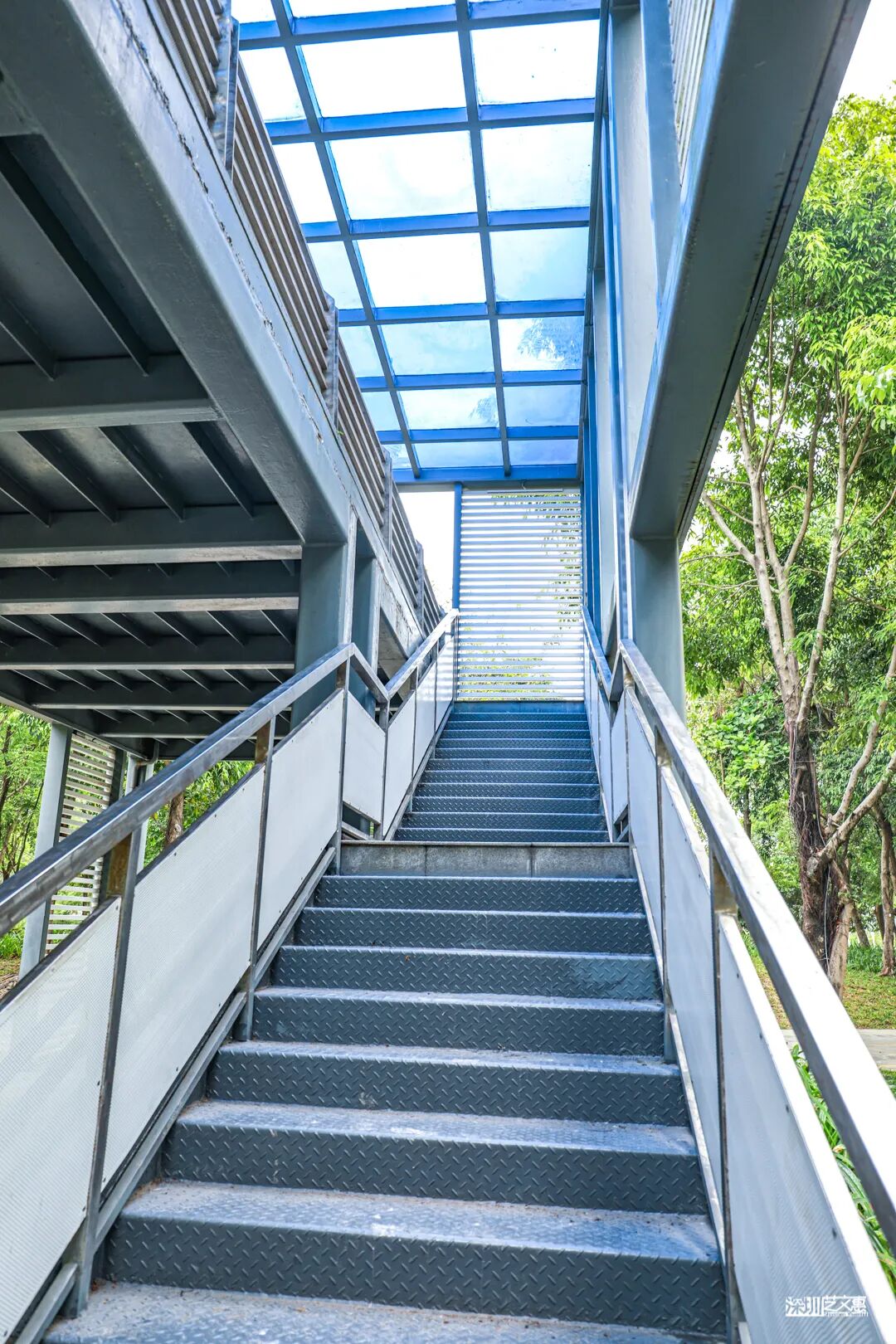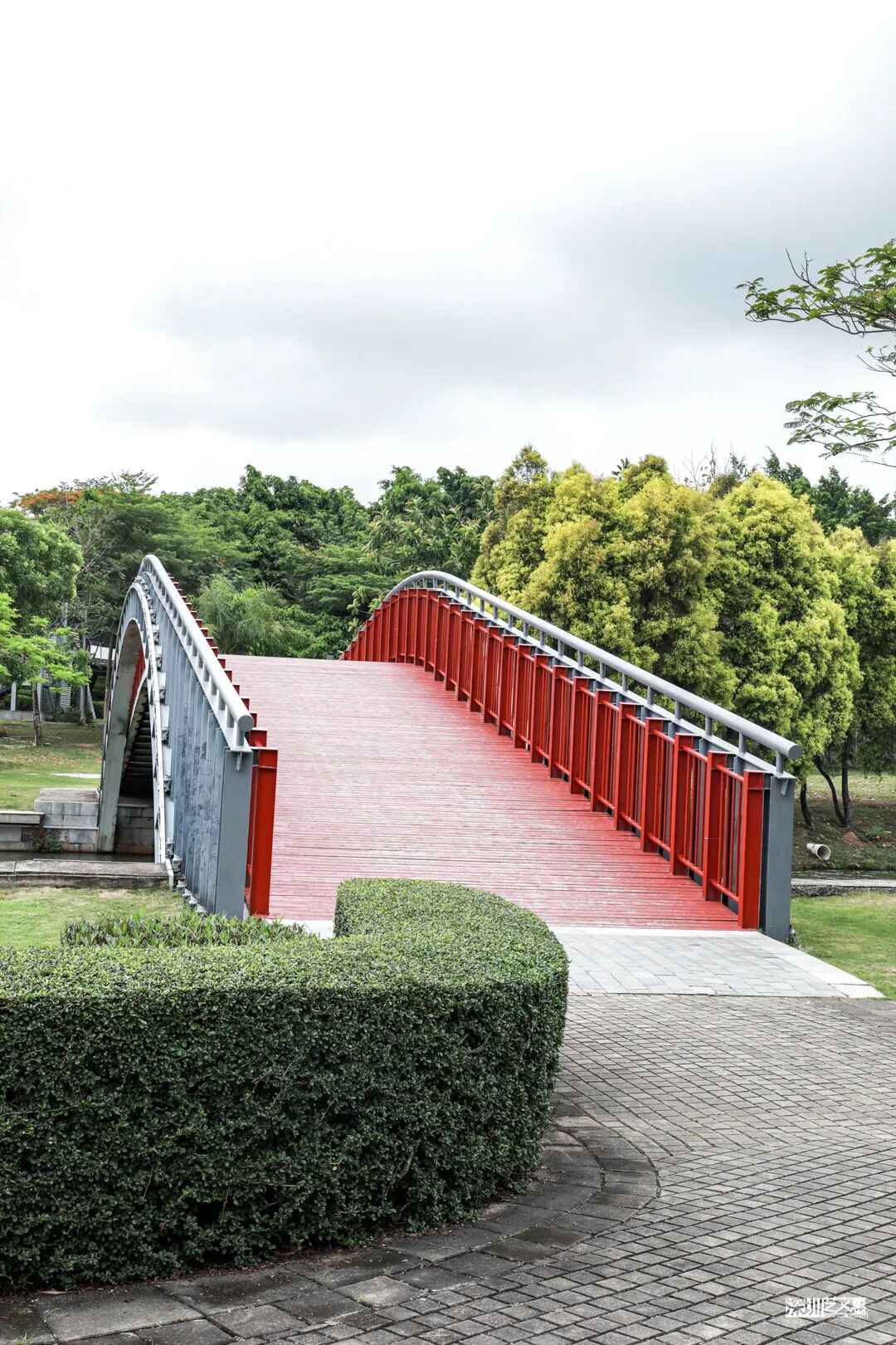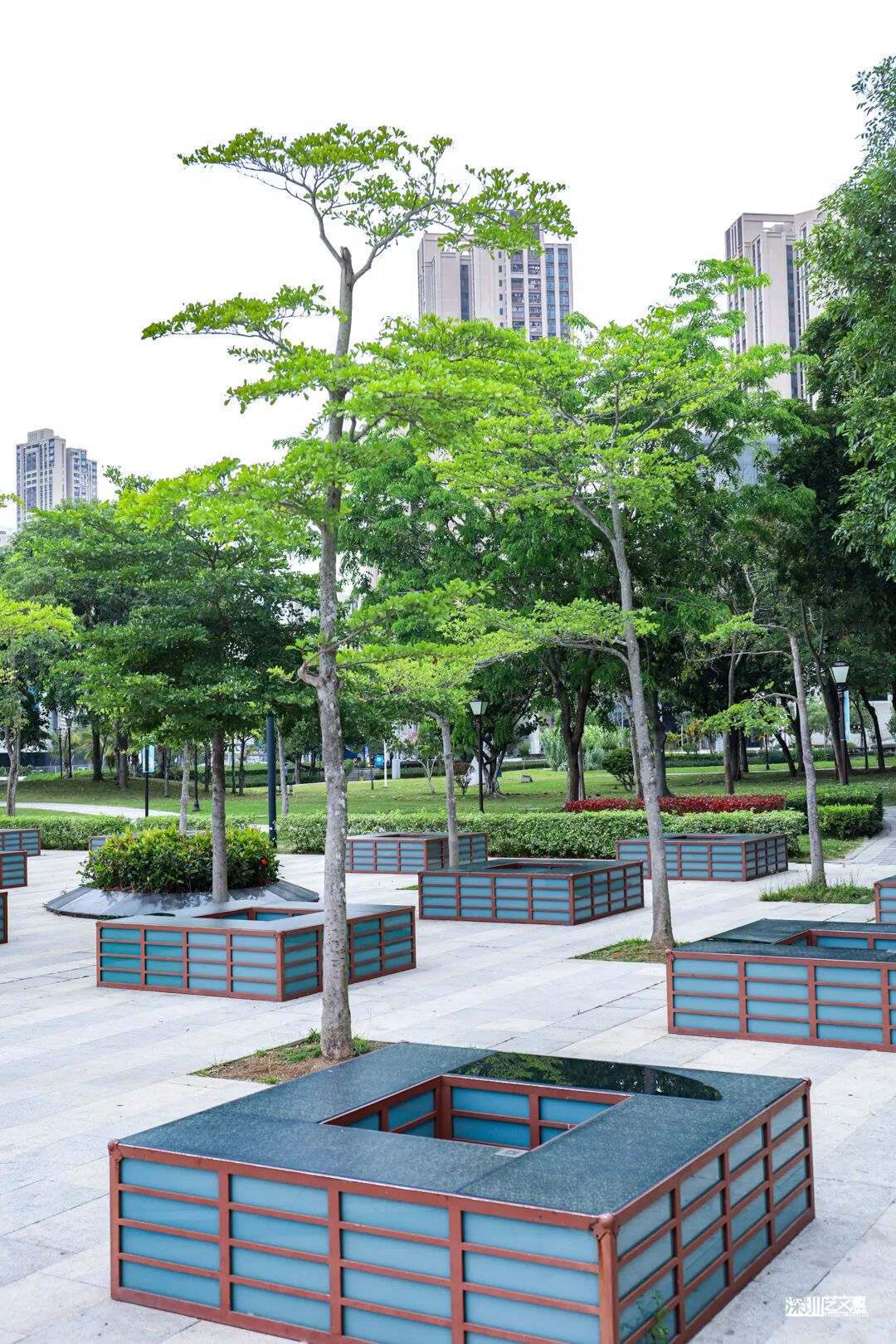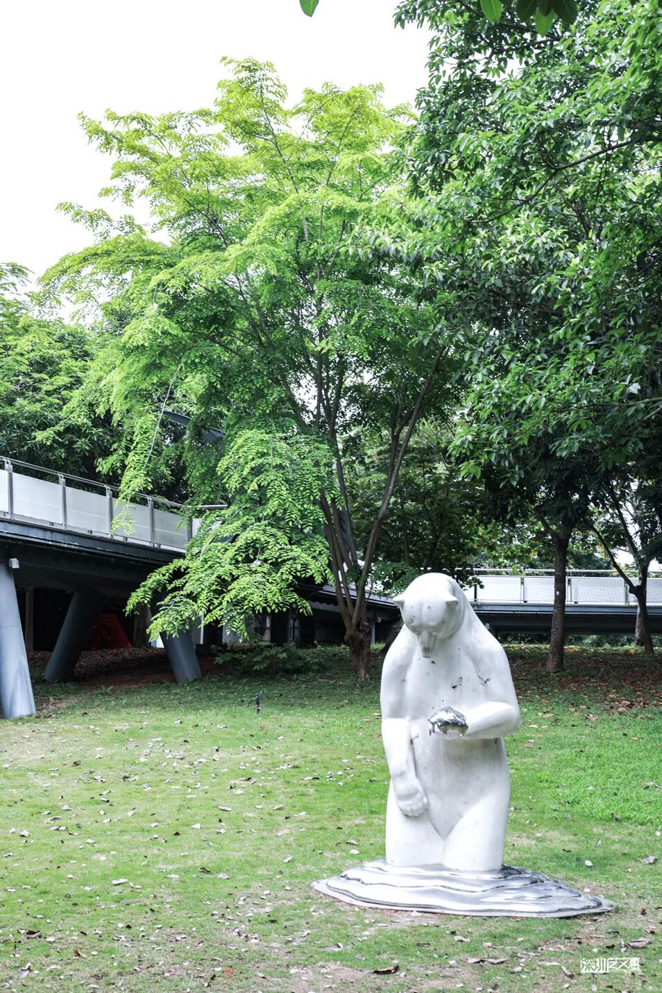 沿着二层连廊向前走,可俯瞰林间美景,亦可眺望湖景与城区楼群,于阴凉的地方,总能看到三五成群的人们在聊天拍照。这里有湖有树有绿草,且一直有清风伴随,确实是午后休憩,放松身心的好地点。