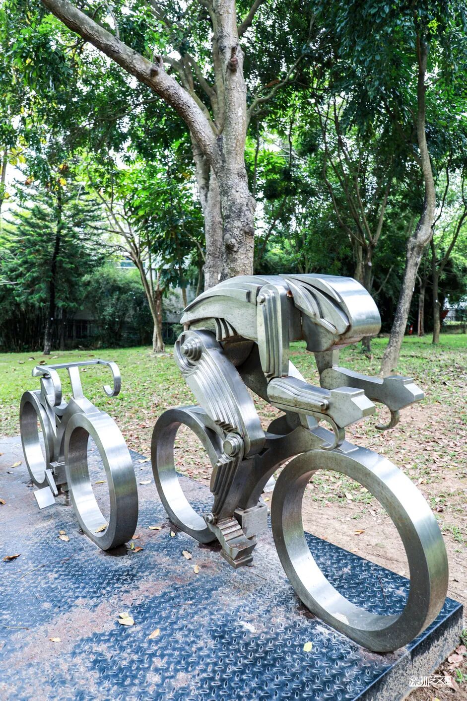 长廊旁边,有着众多趣味横生的雕塑,是众多游人的打卡景点。以骑行者为主题的作品《共享单车》,引发人们对健康生活、绿色出行的深刻思考。