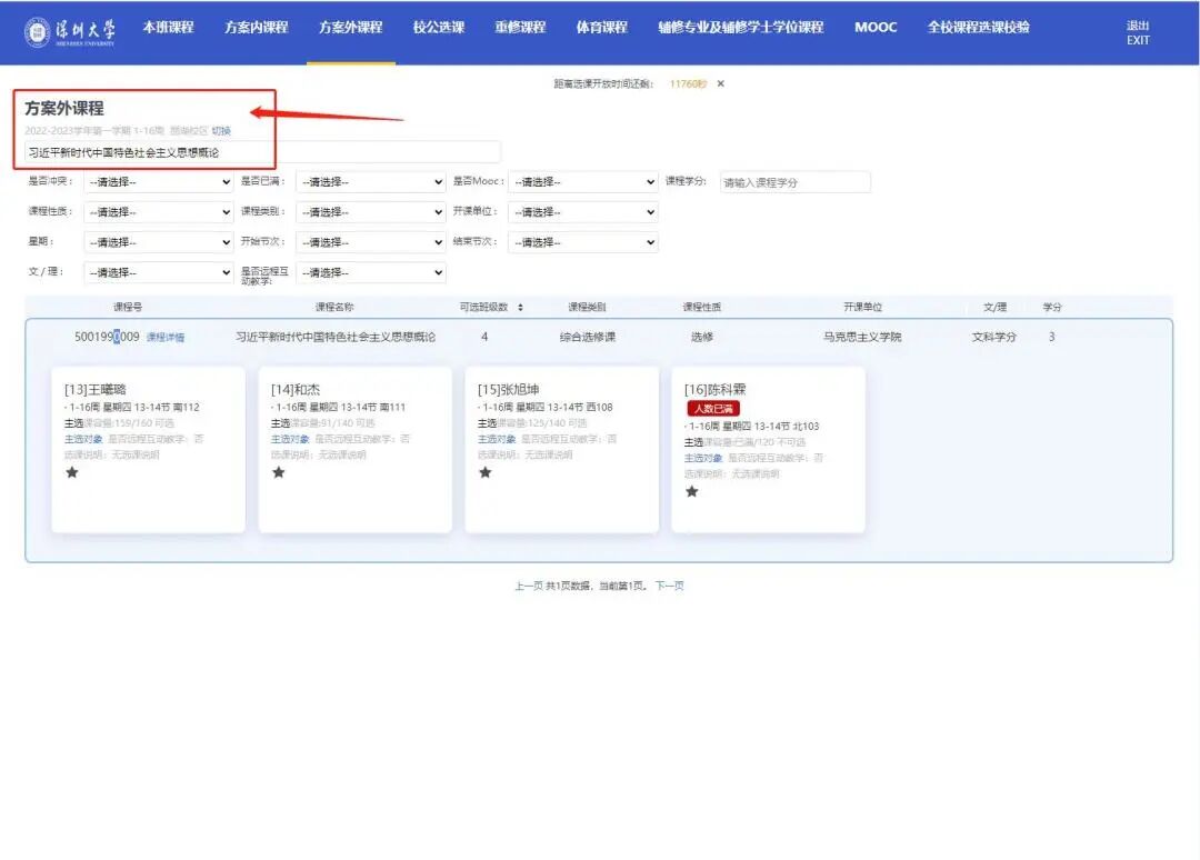 因教学计划调整,本学期马克思主义学院开设的“毛泽东思想和中国特色社会主义理论体系概论(1)”课程停开,尚未选修或须重修该门课程的学生调整为选修“习近平新时代中国特色社会主义思想概论”课程(操作路径:选课系统-方案外课程-搜索“习近平新时代中国特色社会主义思想概论”,见截图),已在预选阶段抽中“毛泽东思想和中国特色社会主义理论体系概论(1)”课程的学生,学校已按原上课班级全部同步调整至 “习近平新时代中国特色社会主义思想概论”课程,请学生在选课系统开放后及时检查,如有疑问,请联系马克思主义学院(陈老师、吴老师:26732661)。