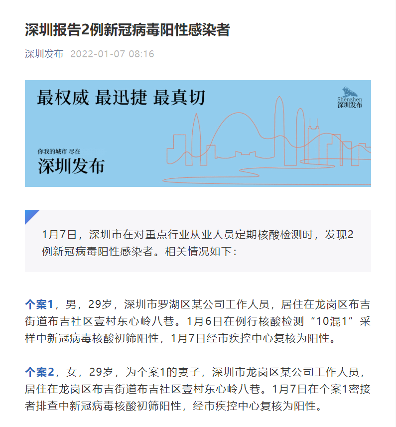 1月7日早晨,“深圳发布”发布消息:“1月7日,深圳市在对重点行业从业人员定期核酸检测时,发现2例新冠病毒阳性感染者”。