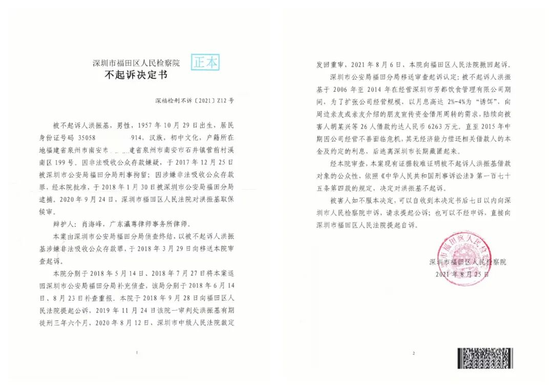 2021年8月25日,福田检察院认为现有证据较难证明洪振基借款对象的公众性,作出不起诉决定。