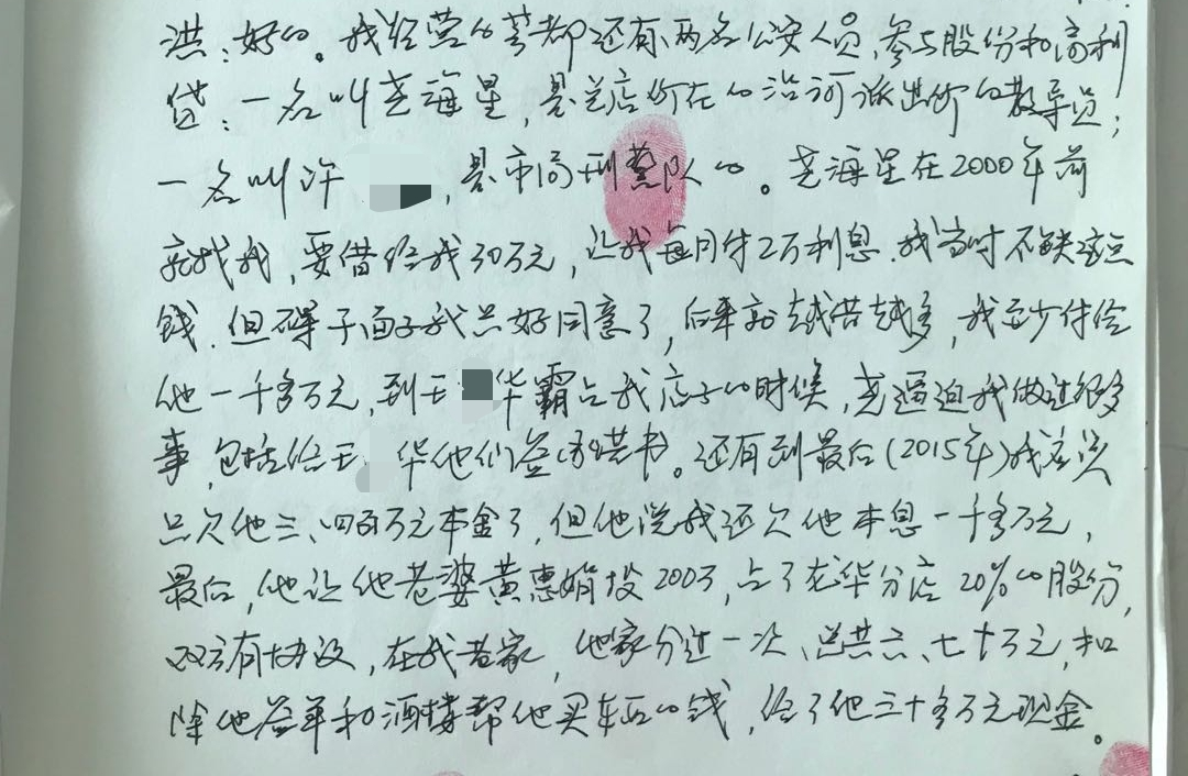 洪振基在看守所中亲笔讲述两名公安人员向其放高利贷及入股酒楼经过。刘虎 摄