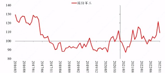 我们这张图使用的是国防军工相对于万得全A的价格指数,就是国防军工的价格指数除以万得全A的价格指数。然后某个时间点设定为100,我们来看它的变化。