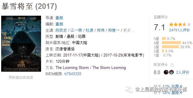上个月,《暴雪将至》先是在东京电影节评选,随后又在国内上映。