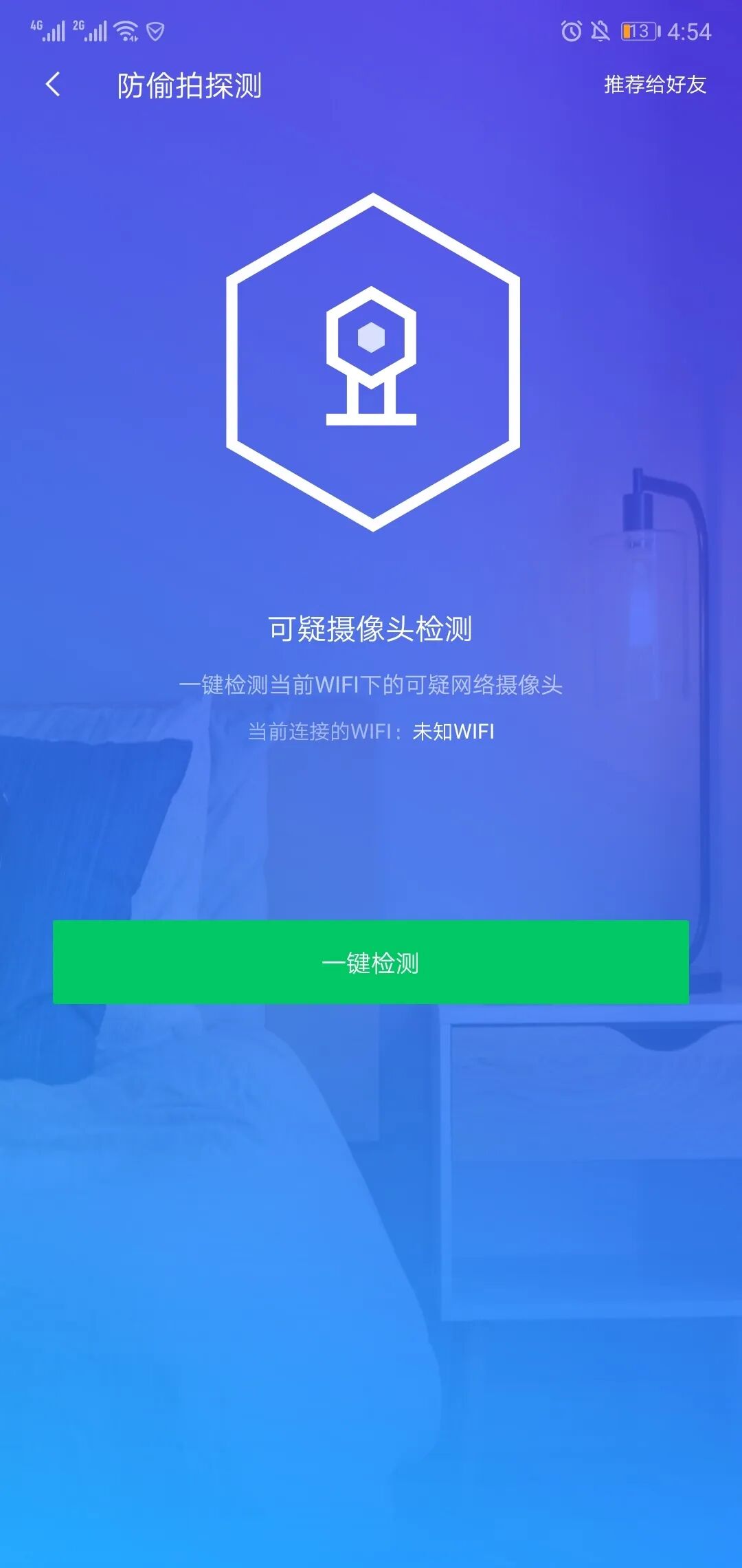 而这些商品的文案,虽然打着家用的名号,却又带有相当强的暗示。网络上流传着很多用手机就能检测摄像头的方法,比如说:通过手机的相机镜头来找到红外线点,而这个方法真的很鸡肋。既然是偷拍设备,为了隐蔽大概率是没有安装红外线模组的。尤其是特别小的那种设备,根本没有足够的电量去驱动红外,所以用于偷拍的设备大都会取消这项功能以防止被发现。还有就是用软件检测,比如之前流行过的Fing,通过检测当前WIFI连接的所有设备来排除摄像头。但它其实只能检测到正在使用当前WIFI的部分设备,无法检测到使用有线传输的设备。对于使用配有SD卡的储存型偷拍摄像头,Fing一点办法都没有。总之Fing这一类的软件,也只能当作参考。另外也可以做参考的是腾讯管家下的一项小功能——「检测摄像头」,据官方说该功能的原理是运用了鹅厂开发的可疑网络摄像头探测引擎技术。且在你入住某个高风险酒店或者场所的时候,软件会及时推送消息提醒检测摄像头。下载安装这款软件,连接酒店WIFI,打开腾讯手机管家,点击「应用安全」-「隐私风险检测」-「防偷拍探测」-「一键检测」就可以了。但目前来说,这个功能仅限于网络摄像头,后续应该会有对非网络摄像头的解决方案。最硬核的技术流检测软件应该要提到像是Spy hidden camera detector这一挂的,利用扫描蓝牙设备或探测磁场变化检测房间内是否有隐藏摄像头。但这种通过磁传感器对偷拍镜头检测的软件,是必须要有相当近的距离才能够被检测到的。