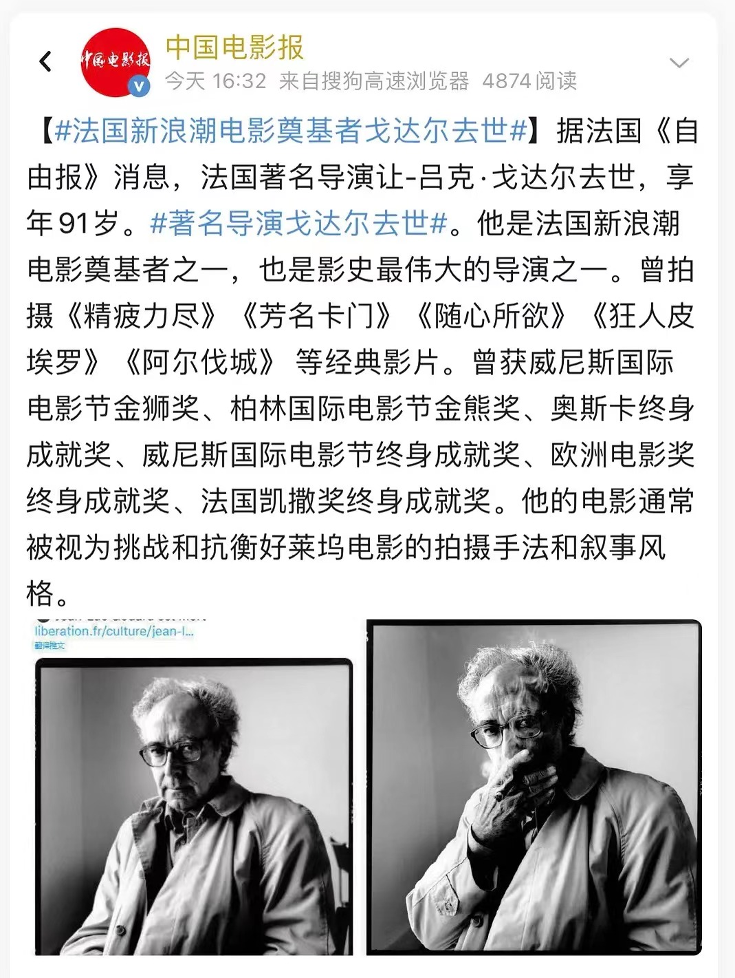根据法国《解放报》消息,法国著名导演 让-吕克·戈达尔 于2022年9月13日去世。