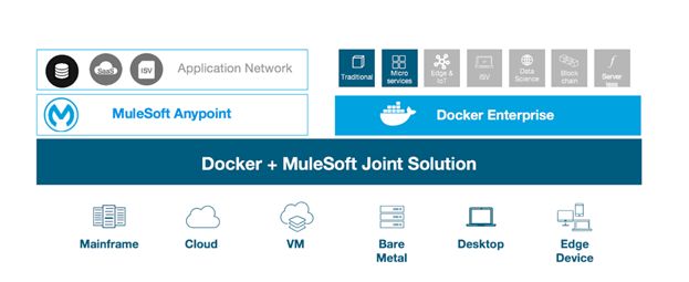 Docker 和 MuleSoft 消除了从构思到部署整个创新过程中的摩擦。MuleSoft 提供了一种自上而下的架构方法,采用 API 优先设计和实现。从容器化应用程序工作负载的角度来看,Docker 采用的是自下而上的架构方法,既可以使旧的应用程序进行现代化改造,也可以创建新的应用程序。