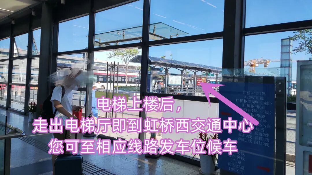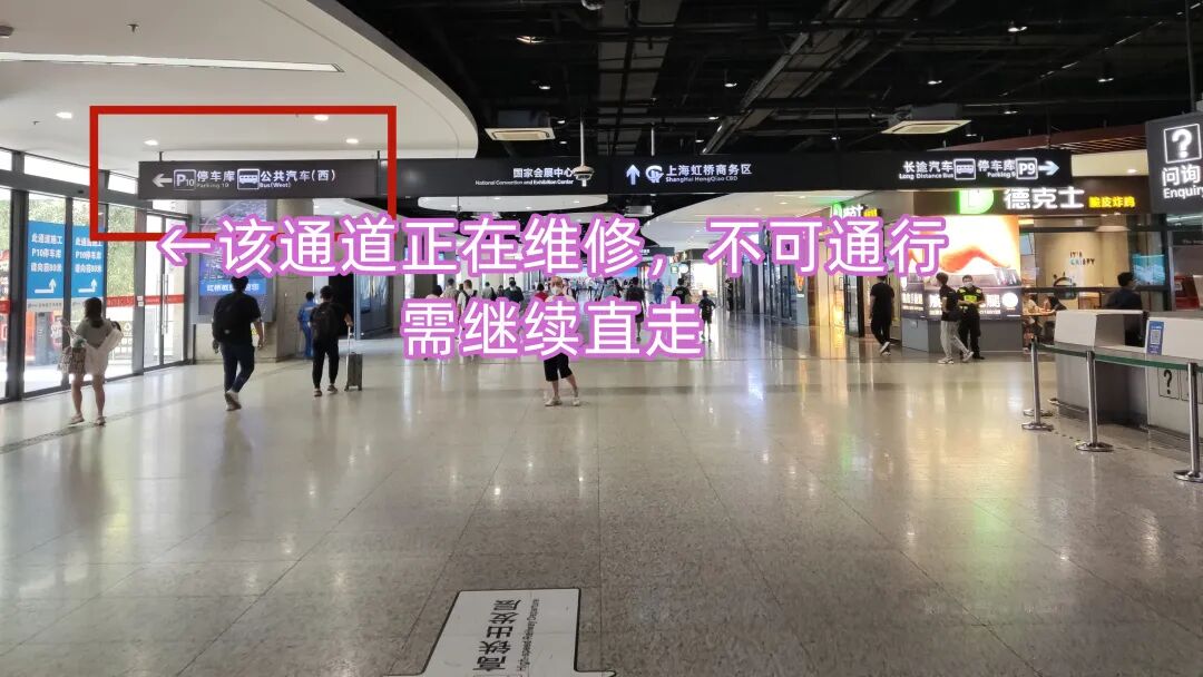 从虹桥火车站通道出发,根据“公共汽车(西)”指示牌直走(如图所示)