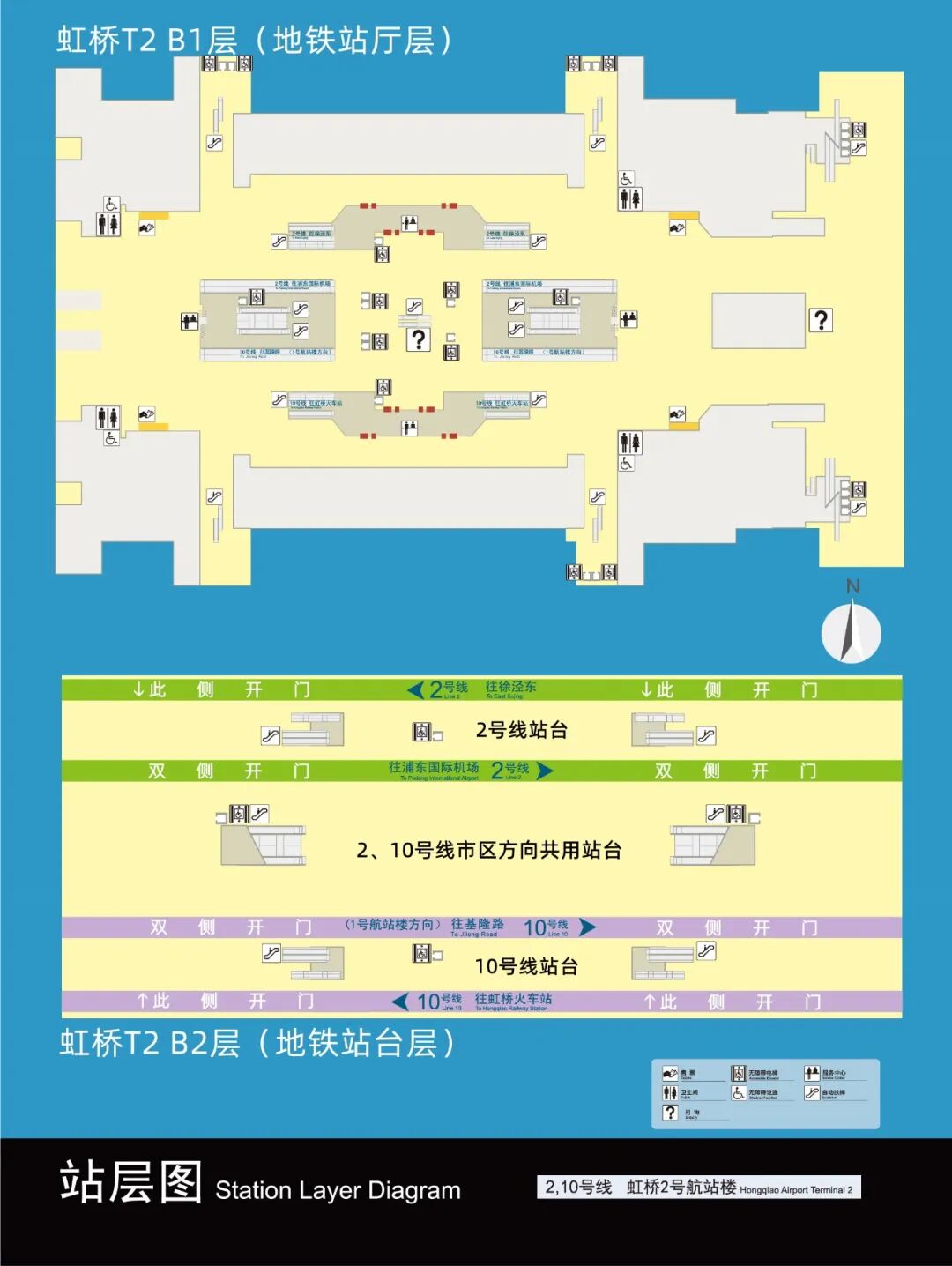 虹桥T2到达后乘坐电梯至B1层即到达地铁站厅。本站共有2号线、10号线两条线路,北侧为2号线,南侧为10号线,具体站位请见图片: