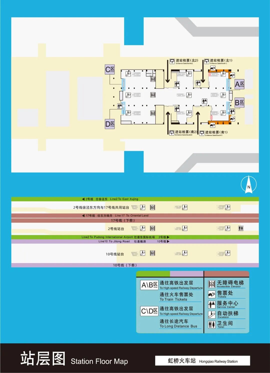 虹桥火车站地铁站位于到达层通道内,标识非常清楚,找到车站很方便。本站共有地铁2、10、17号线三条线路,其中10、17号线为终点站。