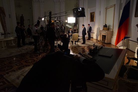 专访当天,由于克里姆林宫是俄罗斯国家政治的最核心区,所以无论是安检还是拍摄,都限制极多。在现场,共安排了俄方媒体3个机位以及央视方面6个机位;其中一个为全景定机位、一个为加装稳定器的游动机位、两台正反打拍摄机位、另有两台5D设备负责为新媒体平台提供竖屏“专供版”。