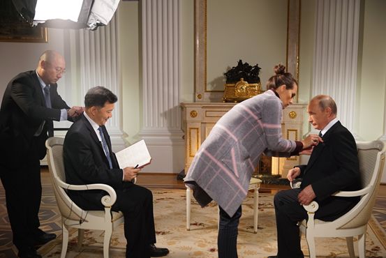 采访前一天,专访团队在俄罗斯中心站进行了一次全要素演练,模拟普京专访现场,对采访流程进行细分、细化,调试机器设备,提前规避技术性障碍,寻找最佳拍摄角度、框定最佳构图,力求拍摄一气呵成。