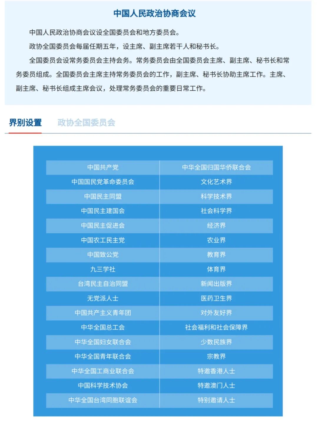 1.不能单独称××界,需加上全国政协、省政协等,如全国政协文化艺术界在京委员、省政协文化艺术界委员。![]()