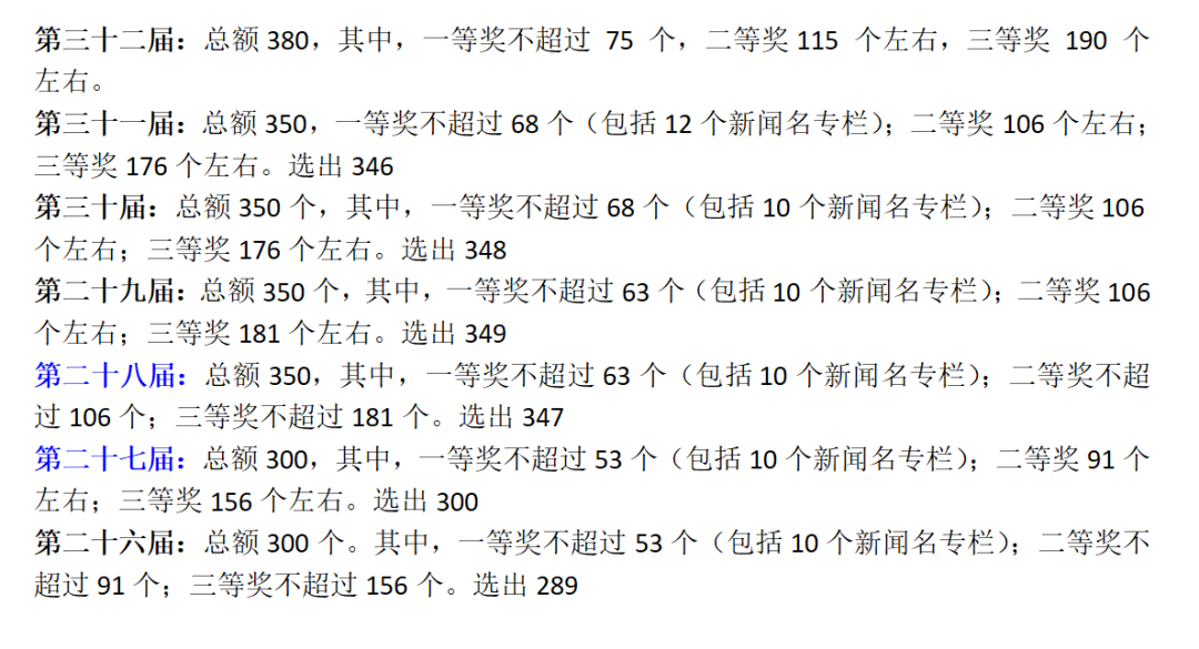 对比发现,一等奖将增加7个左右,二等奖将增加9个左右,三等奖将增加14个左右。值得注意的是,上次总额上的变化还在第二十八届,总额从300个调整为350个,此后一直保持了4届。