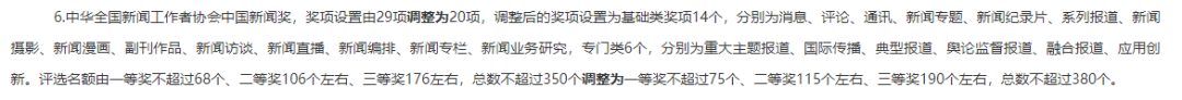 5月17日,全国评比达标表彰工作协调小组办公室发布的《关于2022年第一批评比达标表彰项目的公示》显示,中国新闻奖将有重大调整:中华全国新闻工作者协会中国新闻奖,奖项设置由29项调整为20项,调整后的奖项设置为基础类奖项14个,分别为消息、评论、通讯、新闻专题、新闻纪录片、系列报道、新闻摄影、新闻漫画、副刊作品、新闻访谈、新闻直播、新闻编排、新闻专栏、新闻业务研究。专门类6个,分别为重大主题报道、国际传播、典型报道、舆论监督报道、融合报道、应用创新。评选名额由一等奖不超过68个、二等奖106个左右、三等奖176左右,总数不超过350个调整为一等奖不超过75个、二等奖115个左右、三等奖190个左右,总数不超过380个。而此前,各初评报送单位发布的征集参评作品的通知也与此文件相印证。